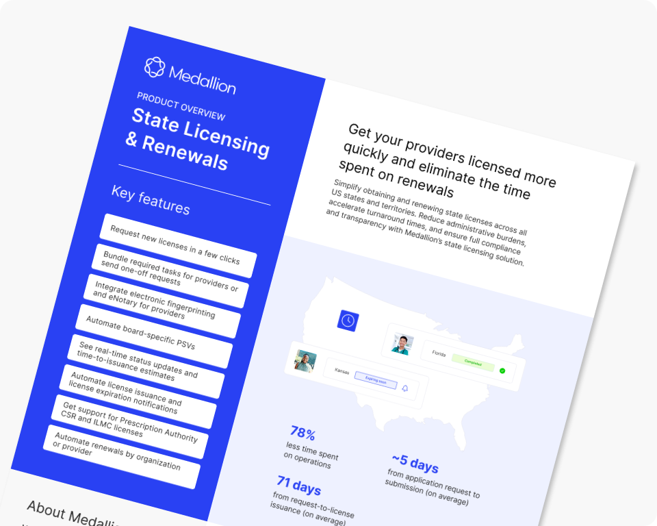 Licensing delays stall expansion, push out provider start dates, and delay revenue. Medallion executes licensing end-to-end—moving providers from request to submission faster, while enabling teams to scale without added operational overhead.